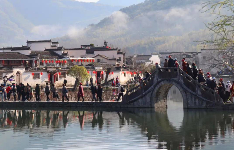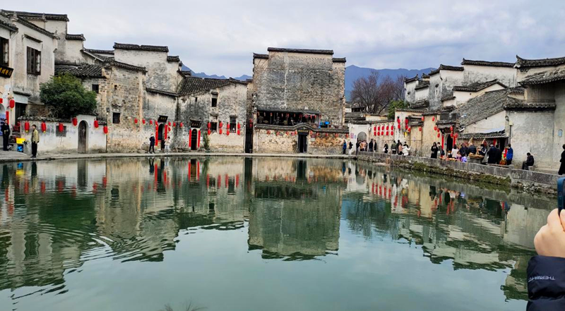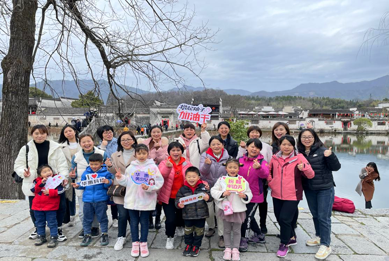 “無邊細雨濕春泥,隔霧時聞小鳥啼。楊柳含顰桃?guī)?,一邊吟過畫橋西?!焙甏宓镊攘κ悄切O具代表性的徽派建筑,古木窗欞,湖水清蓮,拱橋如虹,華惠女工們徜徉在這綿延的青磚古巷中,感受著徽州文化的博大精深。