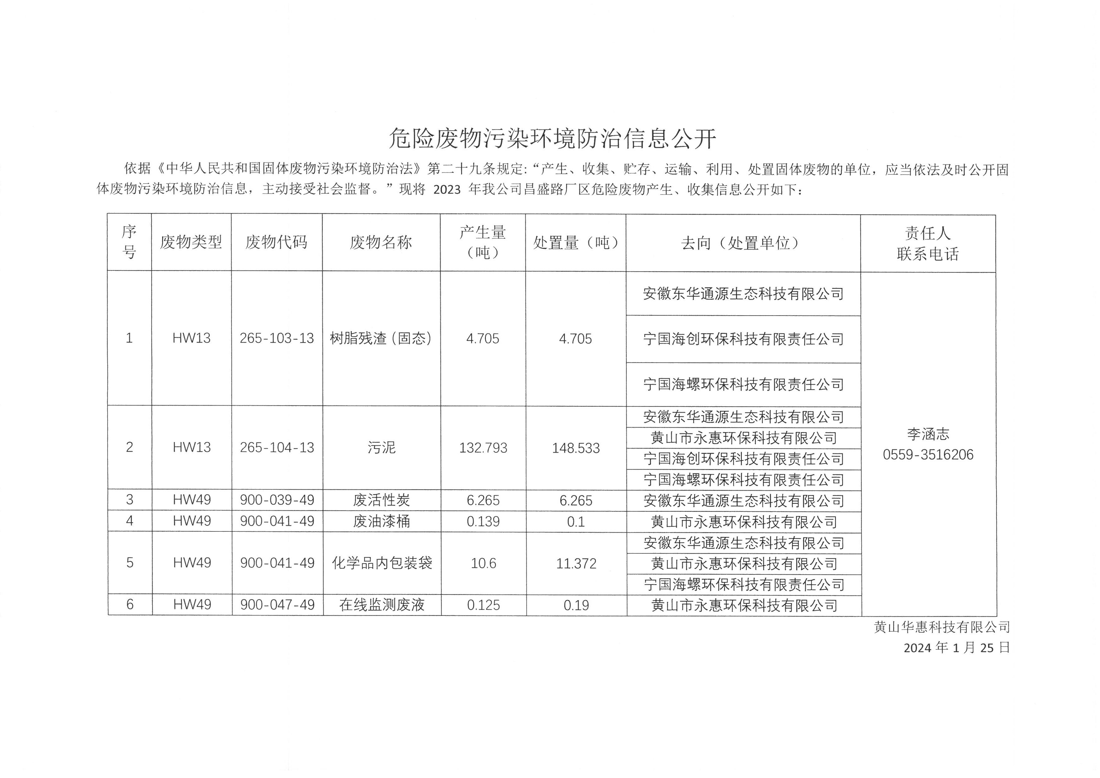 黃山華惠科技有限公司危險(xiǎn)廢物污染防治信息公示